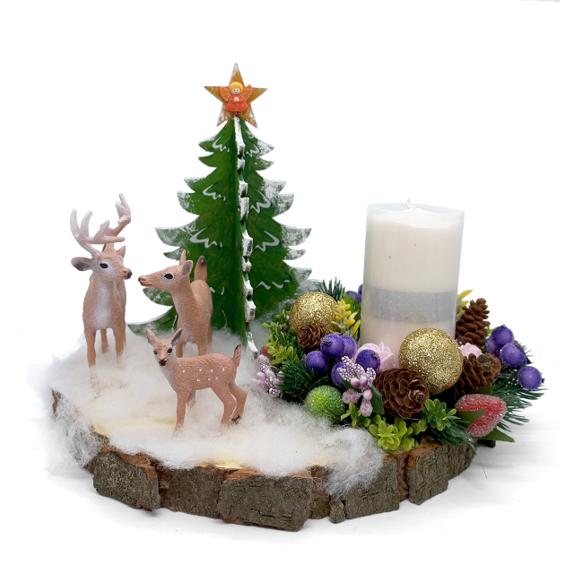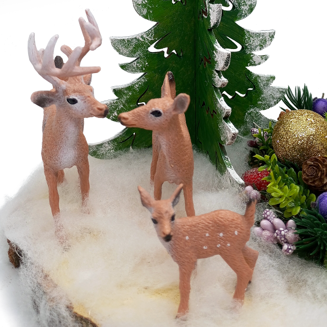 На натуральному зрізі каштана, наче прямо в глибокому снігу, стоїть пухнаста засніжена ялина. До неї із зимового лісу вийшло сімейство оленів – ніжний, зворушливий момент очікування дива. Вони вперше побачили різдвяне світло свічки, прикрашеної святковим ялиновим вінком з кулями, квітами та ягодами, як символ сімейного тепла, затишку та світла, яке ми так бережемо у своїх будинках.