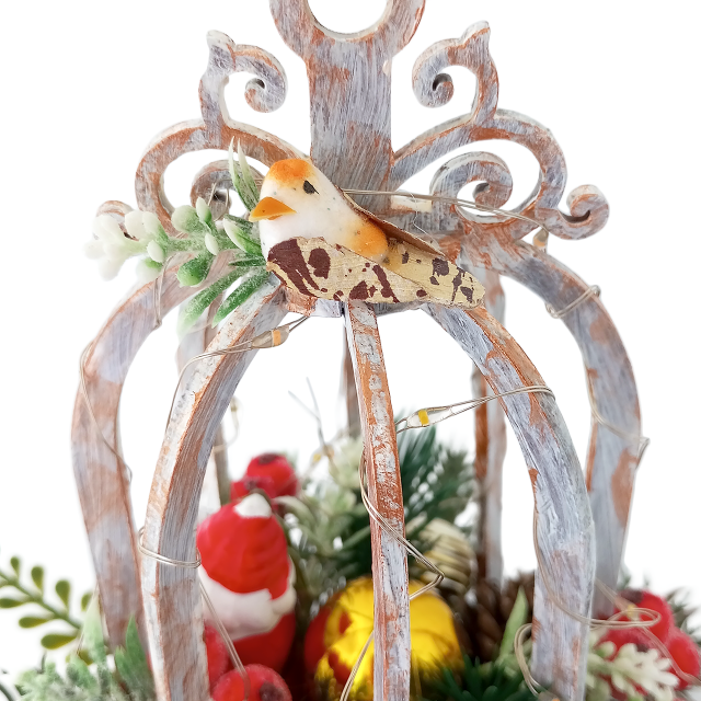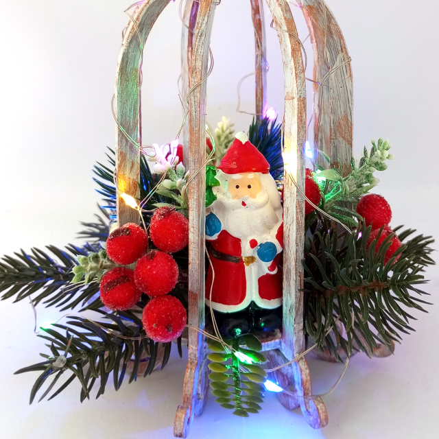 Ця декоративна композиція сформована як акцентний святковий елемент, який одразу привертає увагу та створює чіткий різдвяний настрій у приміщенні. Вінтажна альтанка прикрашена ялиновими гілочками, червоними ягодами та новорічними кульками, а всередині — фігурка Санти, підсвічена м’якою ЛЕД-гірляндою. Завдяки підсвічуванню композиція має ефект глибини й працює як атмосферний світловий декор.