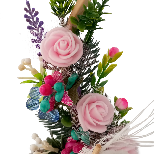 Акцентна квітково-ягідна композиція та мініатюрні ялинові гілочки створюють об’єм і глибину, роблячи декор помітним із будь-якого ракурсу. Завдяки декоративному кільцю композиція виглядає структурованою та гармонійною, нагадуючи невелику арт-інсталяцію.