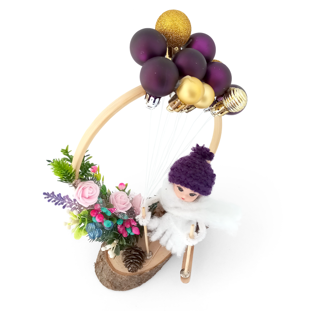 На овальному спилі натуральної вишні розташована яскрава святкова сцена: мила лижниця мчить назустріч Різдву, тримаючи у руках букети новорічних куль — символ святкового настрою та легкості зимових чудес.